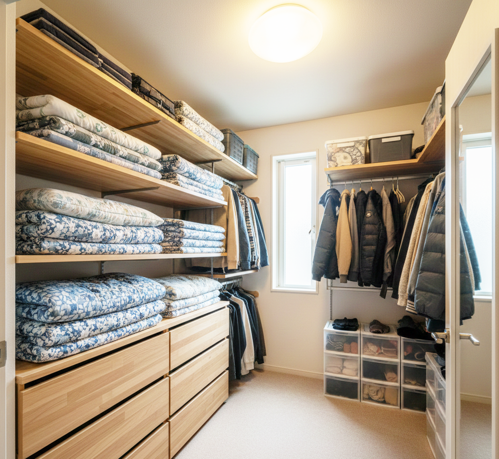 - 季節家電もまとめてスッキリ 布団だけでなく、扇風機やヒーターなどの季節家電、スーツケースなども一箇所にまとめられるので、家全体が片付きます。