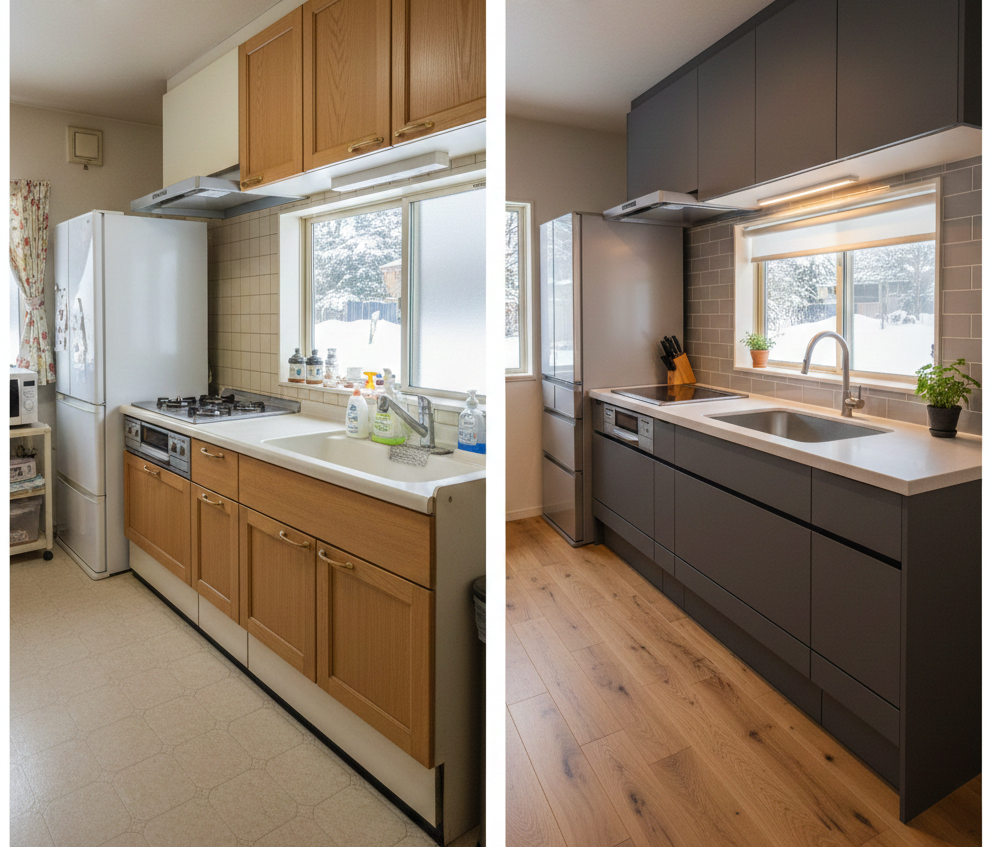 最新のシステムキッチンは、掃除のしやすさ、収納力、家事動線のすべてが計算されています。札幌の冬は家で過ごす時間が長くなるからこそ、毎日使う場所が使いやすくなるだけで、生活の質は驚くほど向上します。