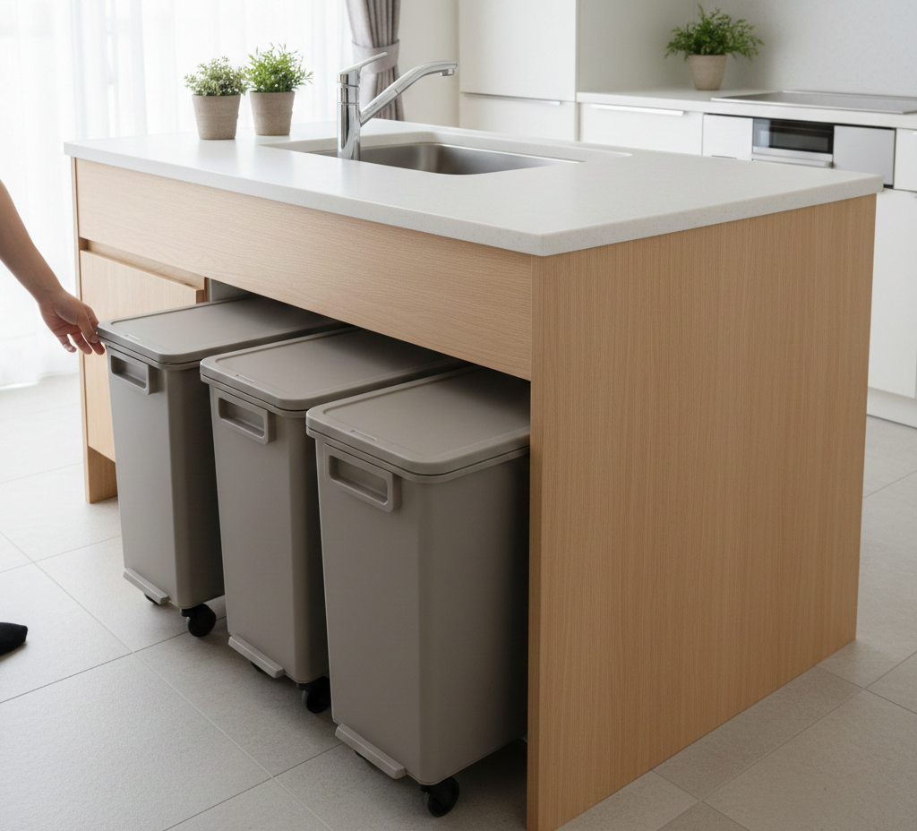 3. 動線がスムーズになる シンクのすぐ下にゴミ箱があれば、調理中に出たゴミをその場でサッと捨てられます。