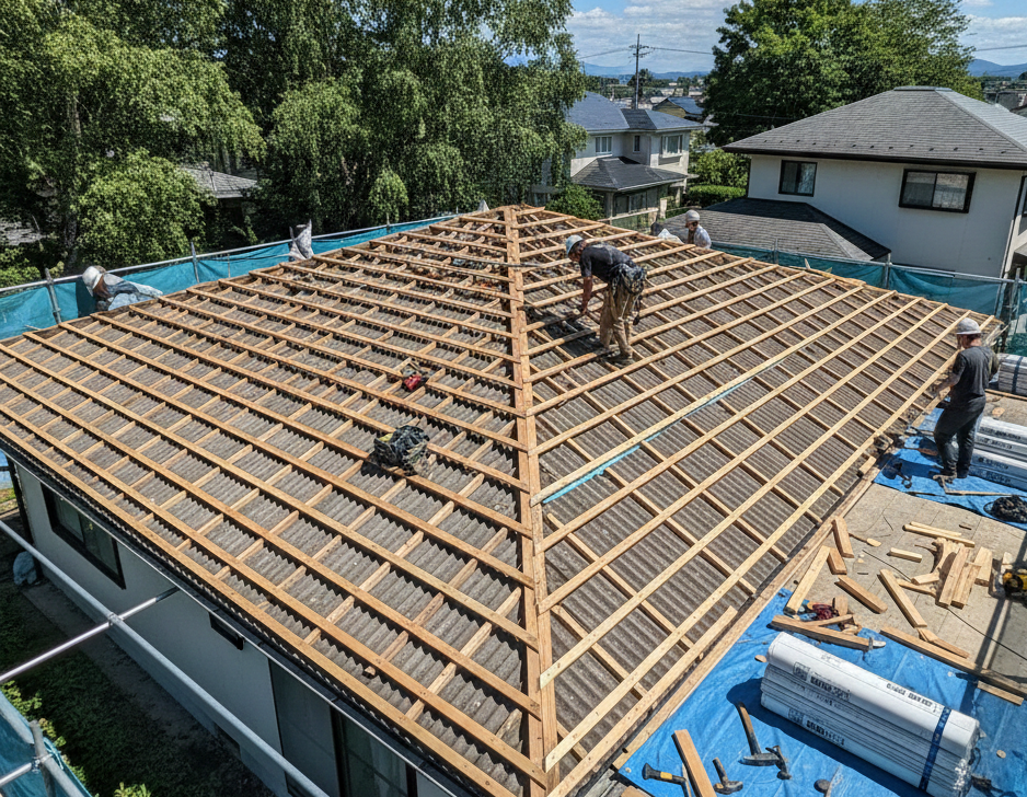 4. 断熱・防水・遮音性アップ! 既存の屋根の上から、改めて断熱材や防水の下地工事を丁寧に行います。屋根が二重構造になることで、冬の寒さ対策や雨音の軽減にもつながります。