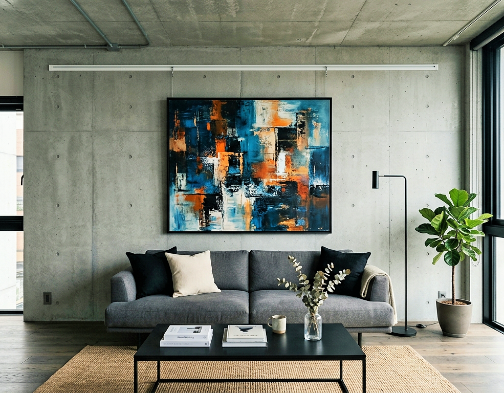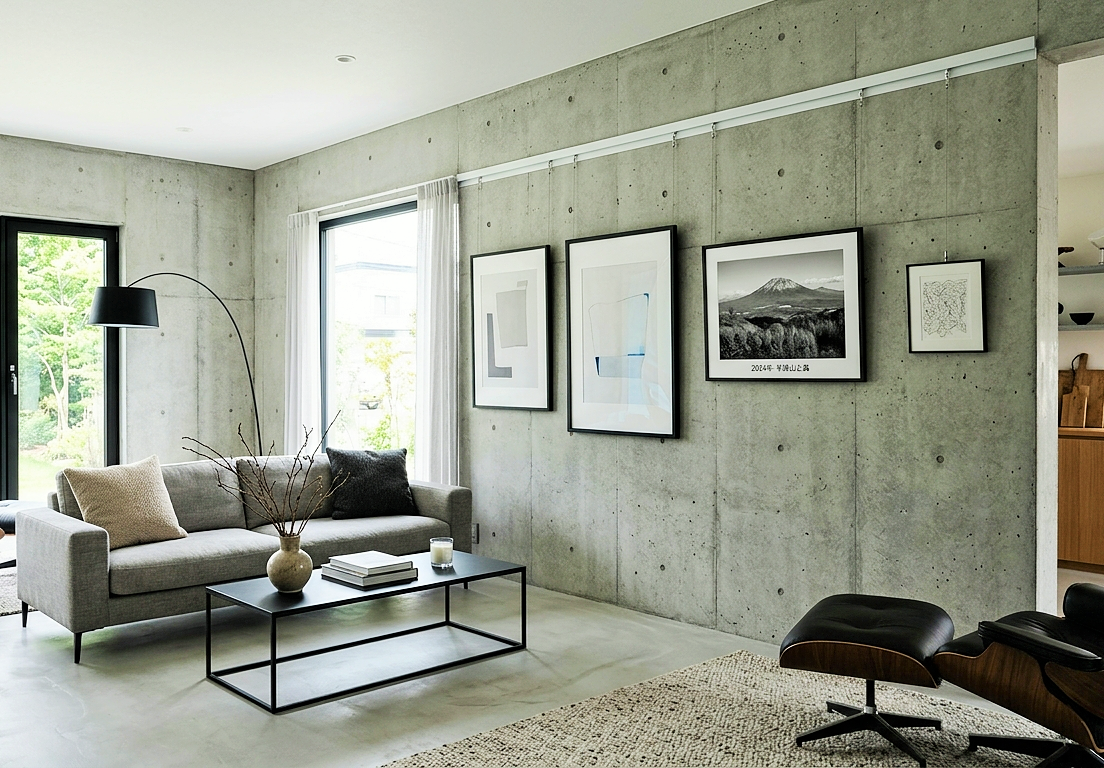 壁に直接釘を打つよりも、ワイヤーで吊るすスタイルは視覚的にスッキリとした印象を与えます。スポットライトと組み合わせれば、ご自宅のリビングがまるでギャラリーのような上質な空間に。