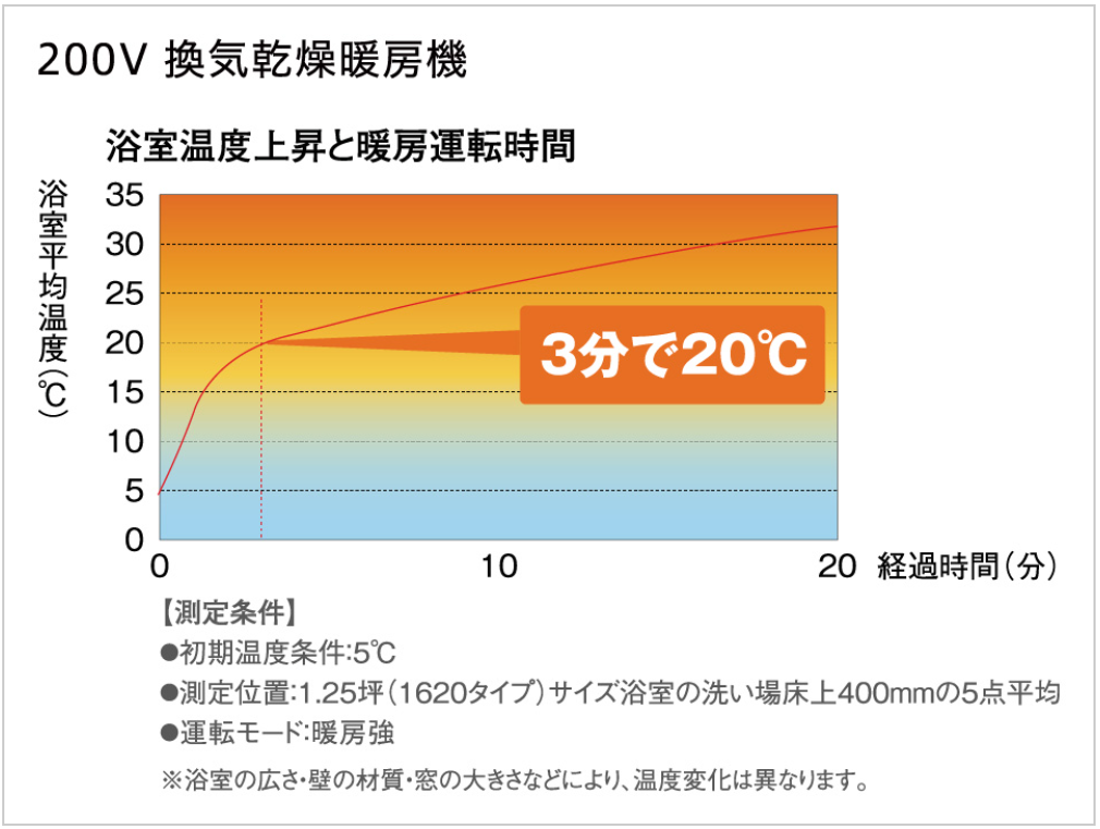 北国の浴室はとにかく冷えます。断熱性能が上がったとはいえ、洗い場の一歩目がヒヤッとするのは辛いもの。入浴前に「暖房」スイッチを押しておけば、浴室がポカポカに。急激な温度変化によるヒートショックの予防にも繋がります。