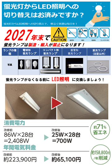 すでにご存知の方も多いかもしれませんが、国際的な環境規制(水俣条約)に基づき、2027年末までにすべての一般用蛍光灯の製造と輸出入が禁止されることになりました。