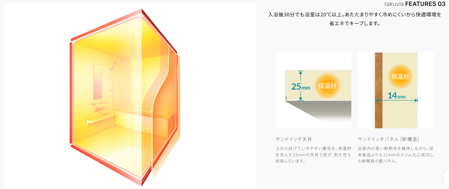 ・TOTO魔法びん浴槽:元祖・高断熱浴槽。浴槽の下を「魔法びん」のように断熱材で包み、4時間後の温度低下をわずか2.5℃以内に抑えます。
