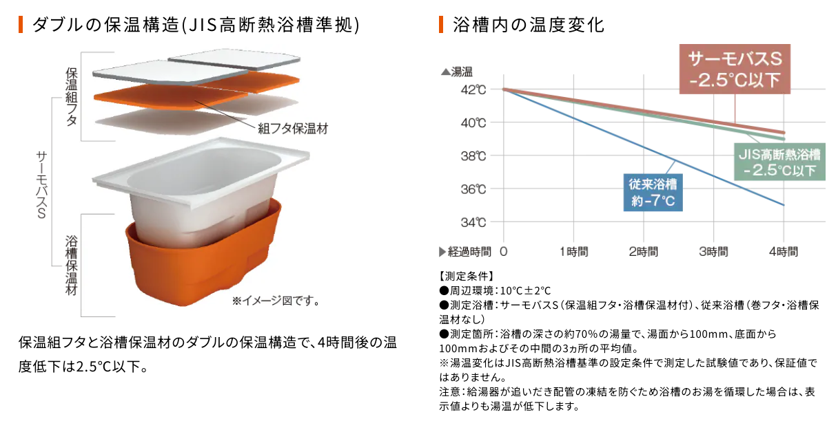 ・LIXILサーモバスS:浴槽保温材と保温組フタの「ダブル保温」構造。お湯が冷めにくく、最後の一人まで温かさが続きます。
