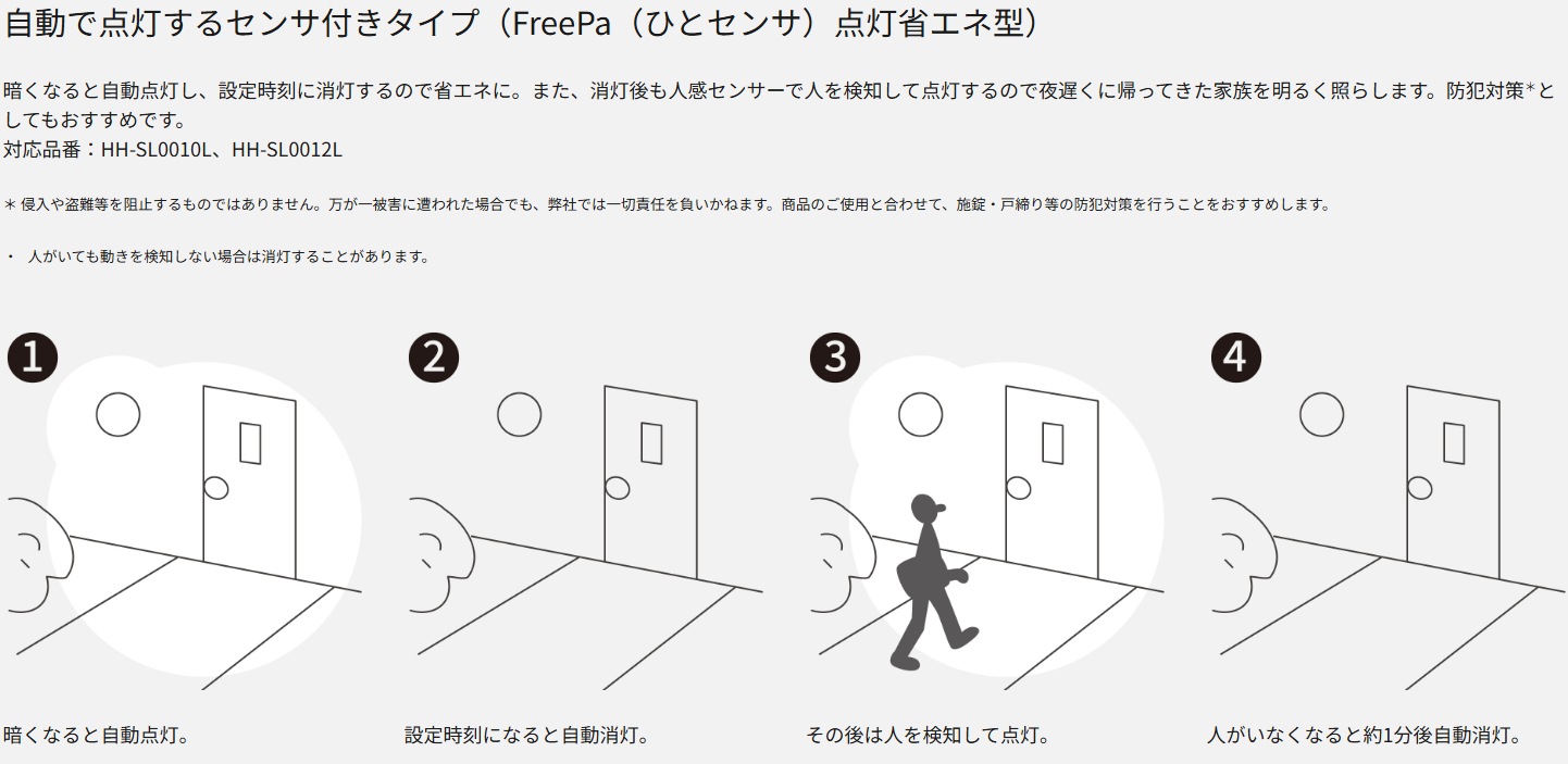 「消し忘れ」の心配がないのもセンサー式の良いところ。人がいない時は自動で消灯(または減光)するため、一晩中フルパワーで点灯させておくよりも経済的です。